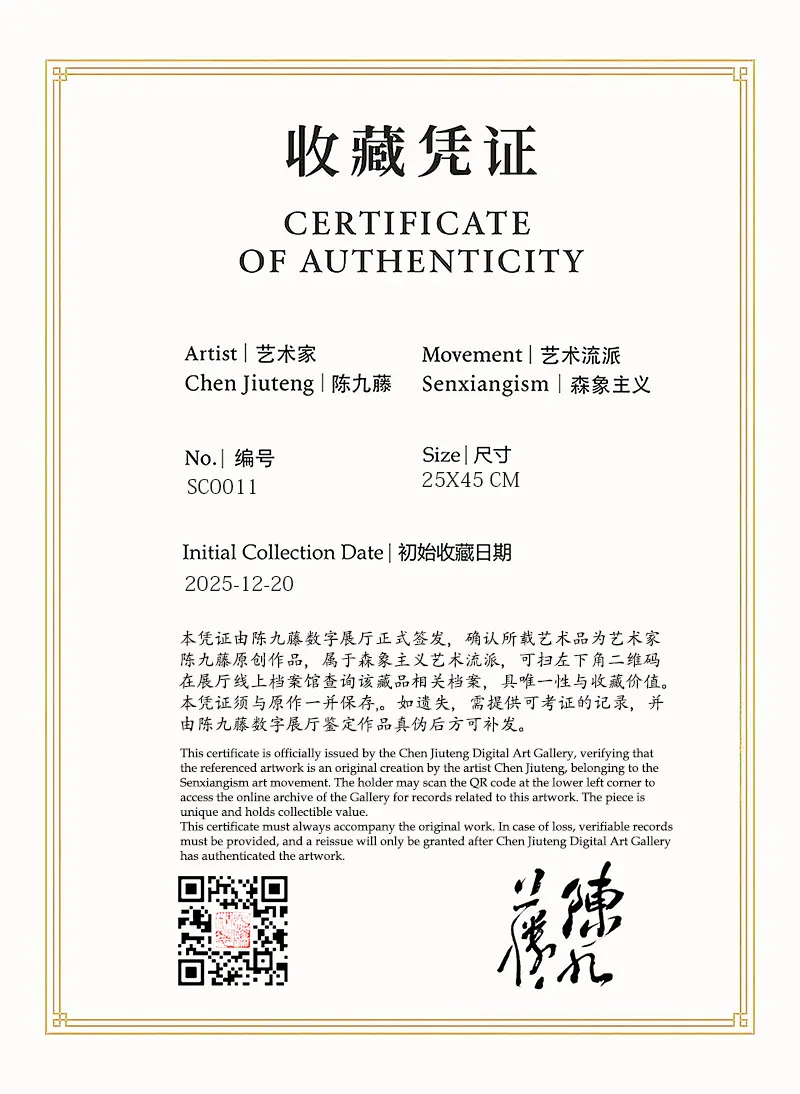 该作品于2025年10月27日被北美藏家收藏,并提供以下实物拍摄照片。收藏证中的尺寸指画芯尺寸,非装裱后尺寸。