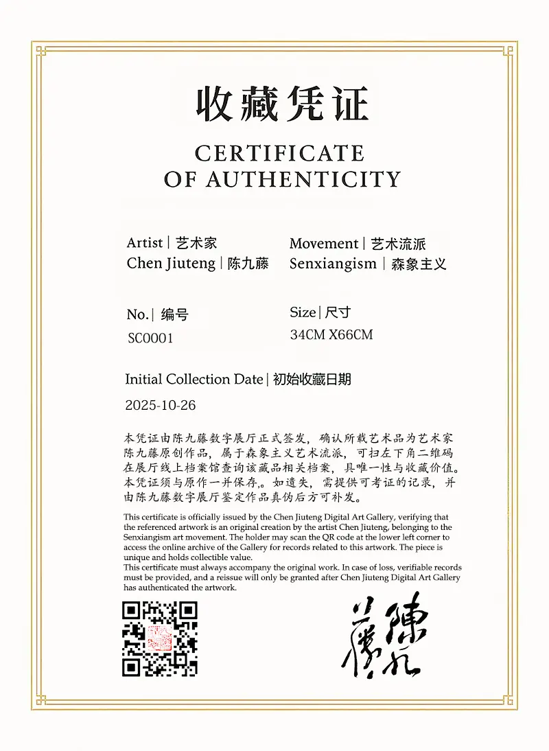 该作品于2025年10月26日被北美藏家收藏,并提供以下实物拍摄照片。收藏证中的尺寸指画芯尺寸,非装裱后尺寸。