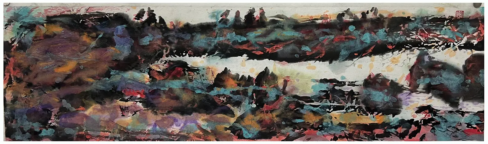 • 色彩:墨色通过水分的多寡控制,呈现出从焦黑到灰墨的细腻渐变,构成了画面的骨架与重量感。在这片深邃之上,赭石、暗红、群青、翠绿、熟褐等色彩在交融与覆盖中相互作用。