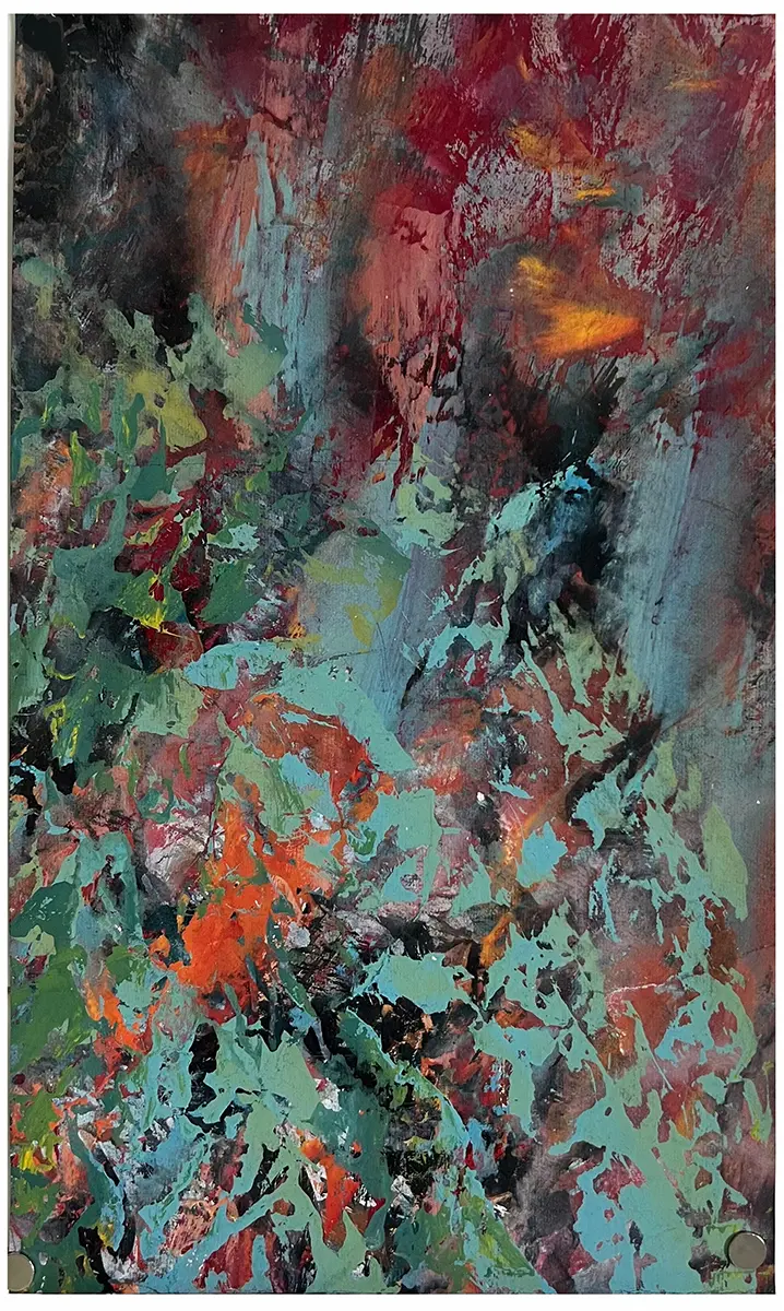 • 构图:所有色块都以一种看似随机实则充满内在逻辑的方式自由分布、碰撞、叠加。笔触奔放不羁,形态扭曲变幻,共同形成一股强大的、漩涡般的视觉动势。