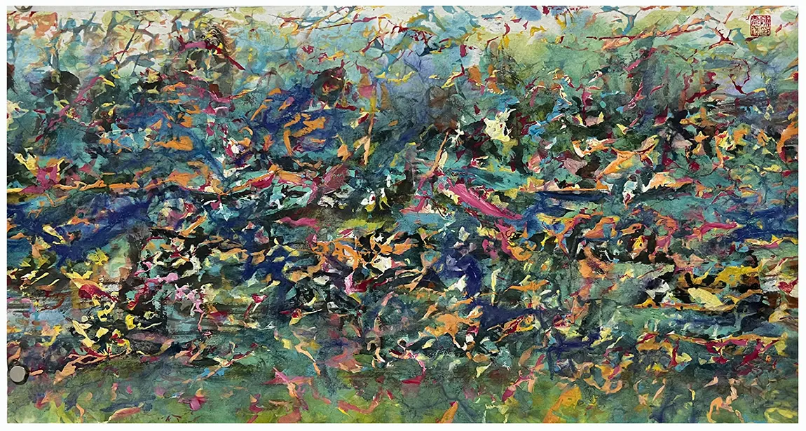 色彩:色彩之间没有清晰边界,相互浸润、叠加,形成斑驳陆离的光影效果,仿佛自然万物在光影下熠熠生辉,充满原始而蓬勃的能量。