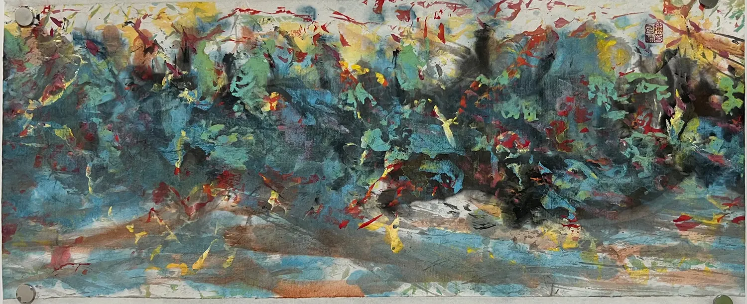 • 色彩:浓郁的蓝、绿色通过水色交融的晕染技法相互渗透,边界朦胧而富有层次,在冷峻中迸发出温暖的能量感。橙红、明黄与乳白色以泼洒般的笔触点缀其间,似晨曦穿透叶隙.