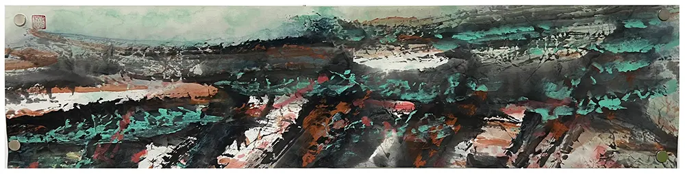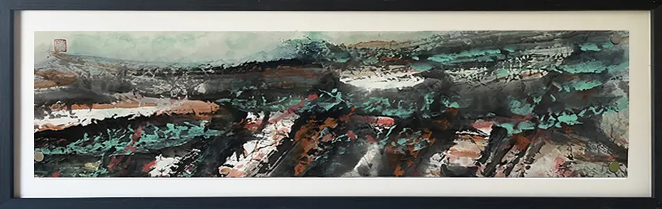 这幅作品是作者走向森象主义的早期创作,气息与前几幅森象系列相比,更接近山川大地的具象化意象。横幅长卷的展开方式,使人联想到传统山水画的开阔境界,但同时又以抽象的笔触与厚重的色彩,赋予画面一种现代感。