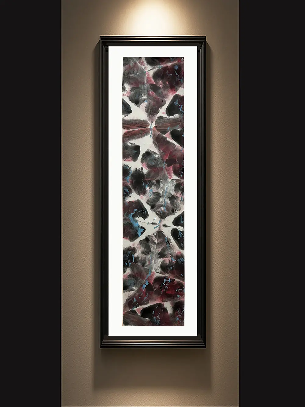 作品以对称的竖幅构图,呈现出如图腾般的神秘力量。深红与黑色交织,厚重而庄严,仿佛大地的矿脉与心灵的暗影。画面寓意自我观照与精神的内省,是自然与灵魂的双重印记。