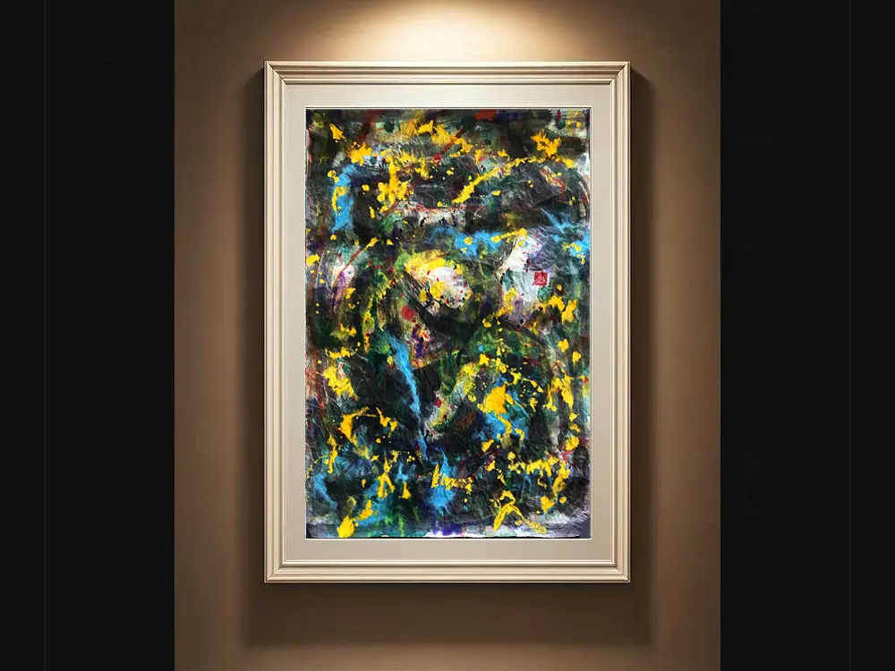 •作品名称:森象·花火 • 作者:陈九藤 • 风格:森象主义 / 东方意象混合西方抽象 • 媒材:生宣,水墨,重彩 • 画芯尺寸:60CMX40CM