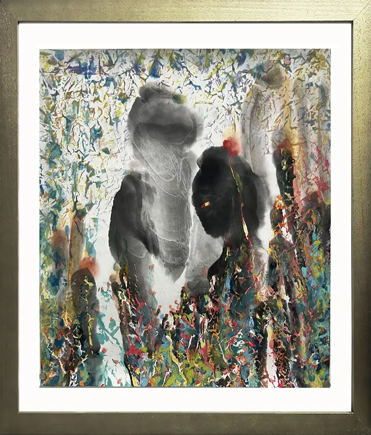 作品以水墨与重彩的交织,描绘出如山石般庄重的中心意象。黑白墨韵象征静观与沉思,下方彩色的草木丛生则寓意生命的生长与希望。画面呈现出自然与心灵的对话,象征内心的观照与觉醒。