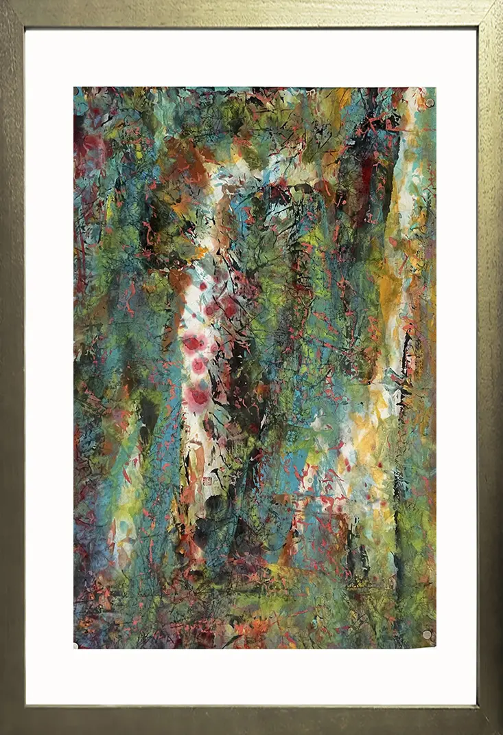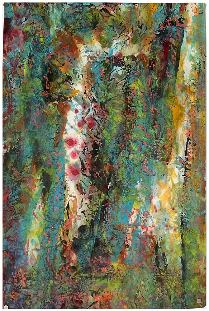 • 色彩:以红色为主调,辅以黑色、蓝色和绿色的点缀。整体色彩热烈奔放。 • 构图:整休如山间奔腾的溪水,周围的色彩则化为枝叶与花影,充满生长与扩展的能量。 • 氛围:热烈、欢腾,给人以旺盛的生命感。