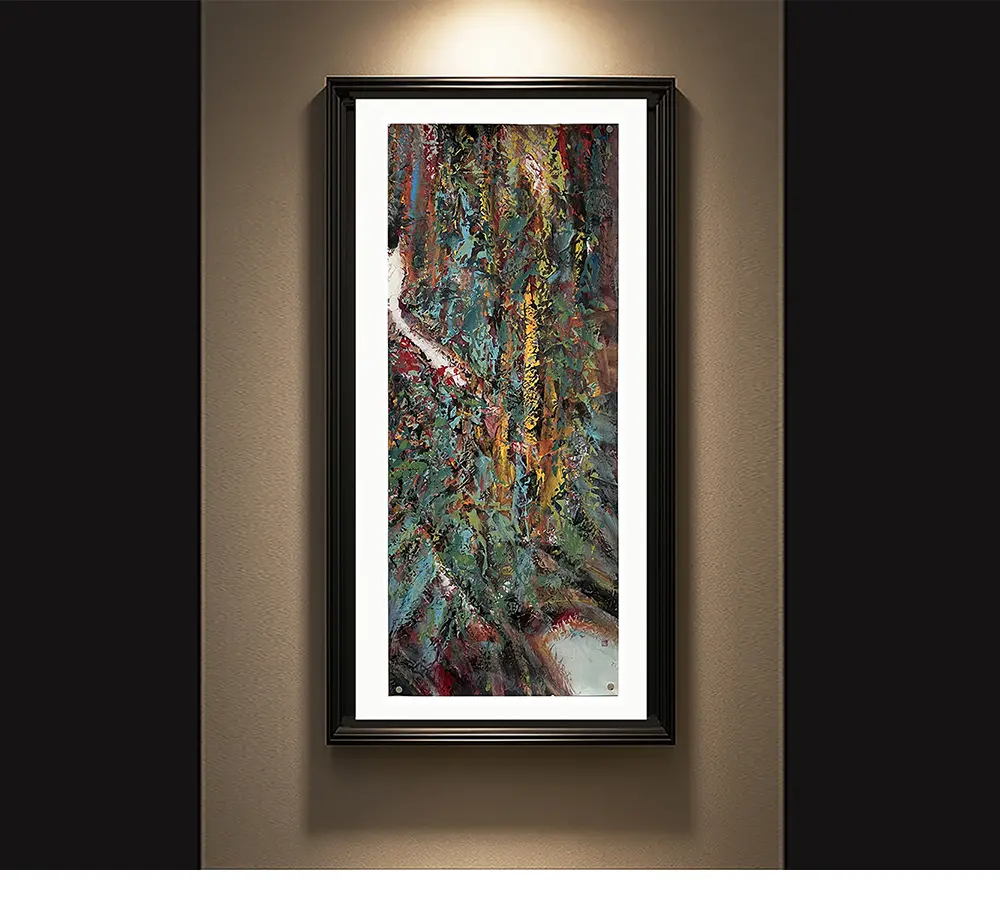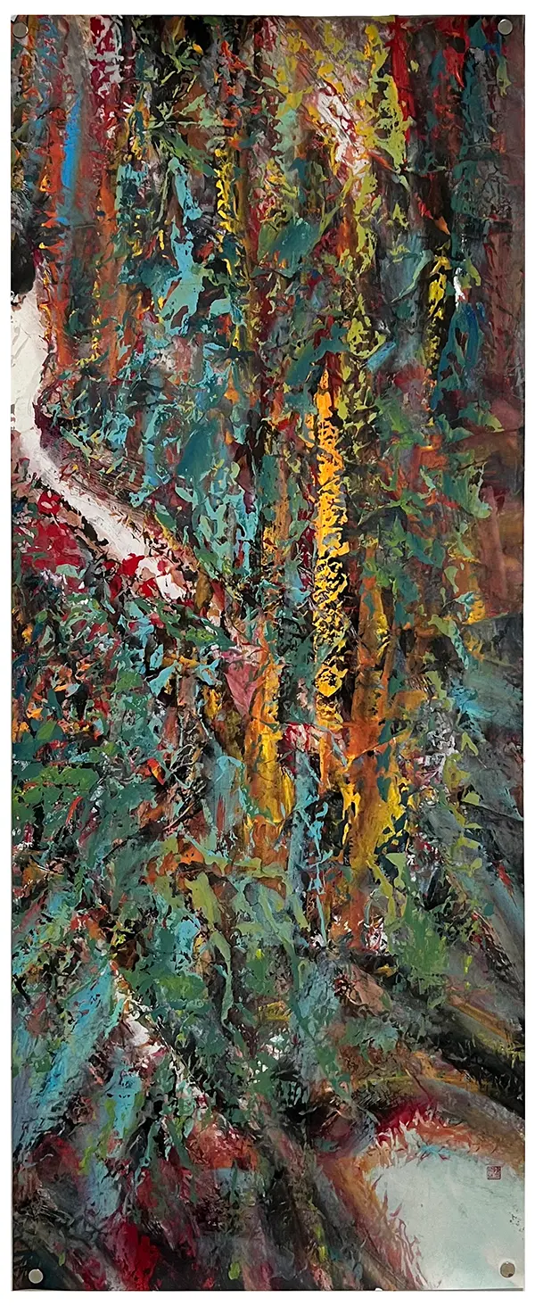 • 构图:采用满幅全景式构图,挣脱边框束缚。藤蔓般的笔触纵向缠绕,形成自然生长的无序美学;泼洒的色斑如阳光碎金穿透林隙,在二维平面创造立体景深。