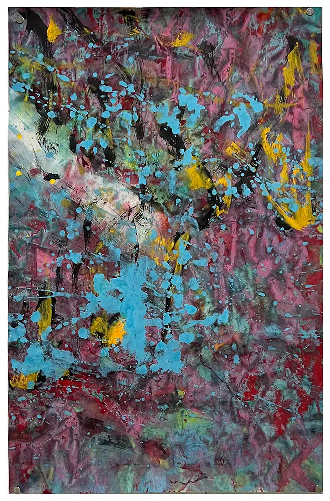 色彩:这幅画以高饱和色彩交织碰撞,冷暖对比强烈,斑斓的色点与泼洒的痕迹形成极具张力的视觉交响。