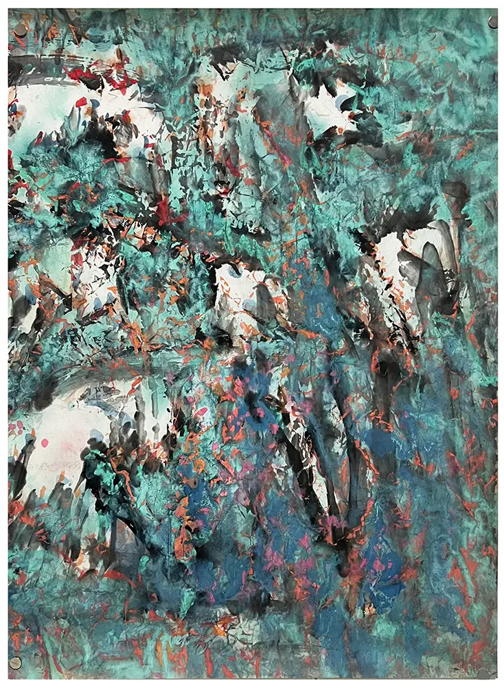作者:陈九藤 创作年份:2022 状态:未装裱,可收藏 • 风格:森象主义 • 媒材:生宣,水墨,重彩 • 画芯尺寸:49CM X 67CM