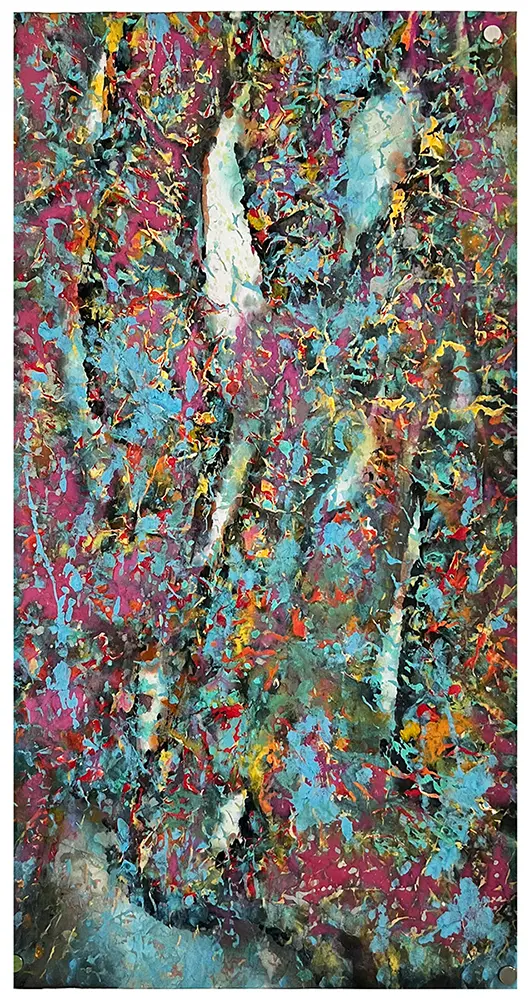 构图:以数道垂直的浅色光柱作为视觉锚点,贯穿画面,如同倾泻于茫茫大海中的光束。它们被周围汹涌的色斑与流动的肌理包裹,在混沌中建立秩序,形成动与静的深邃平衡。