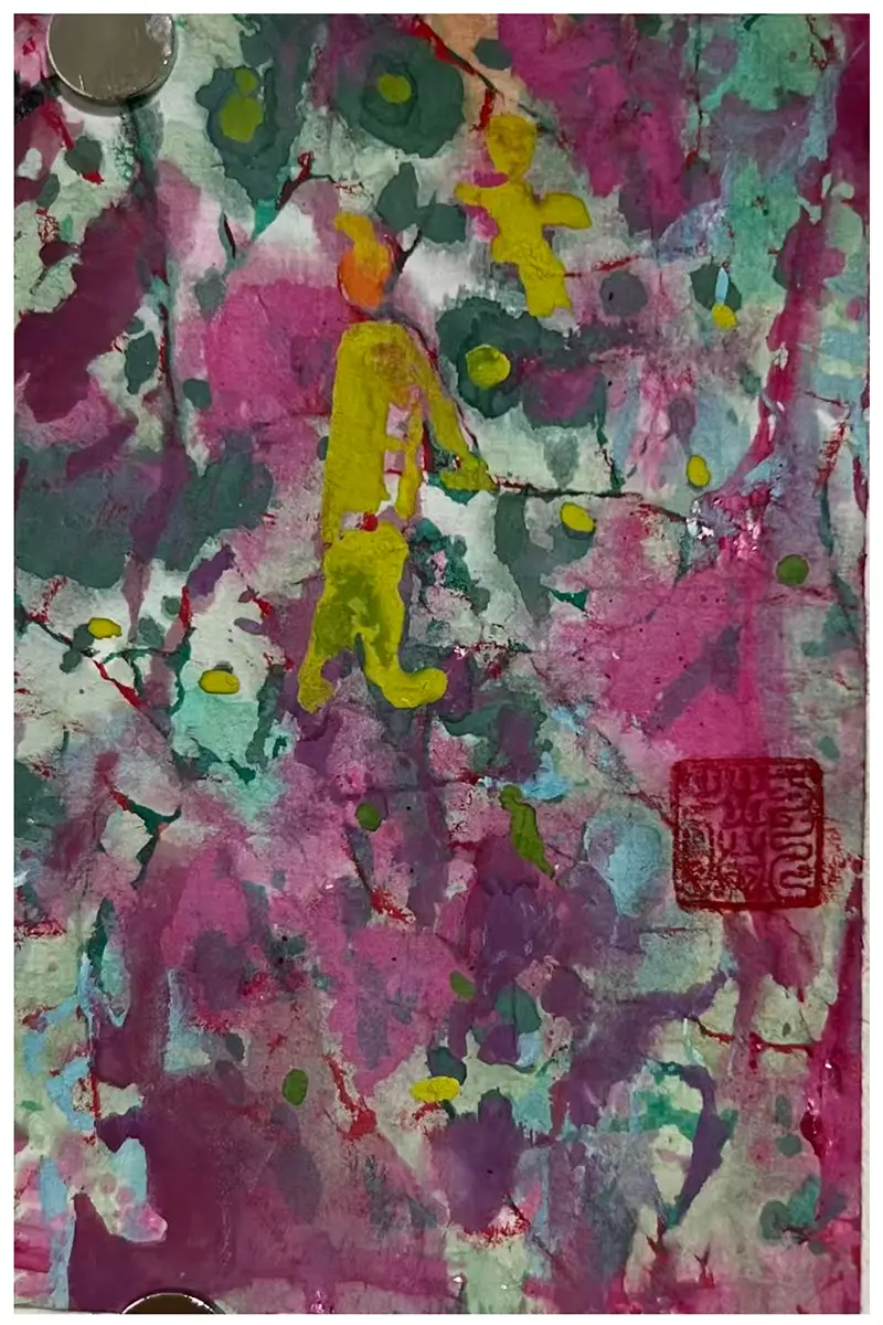 • 构图:四周的背景由自由奔放的色块与线条构成,看似随意泼洒,实则暗含韵律——色彩的浓淡、笔触的疏密、色块的聚散,形成一种围绕主体的环绕之势。