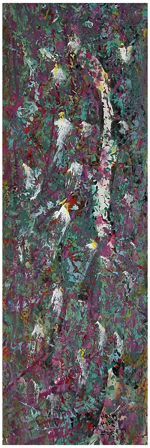 • 色彩:画面以深绿、墨绿等浓郁的绿色作为背景主色调,大量紫色和红色的斑块穿插其中,为画面增添了梦幻般的色彩感。而白色元素也十分突出,它们的存在打破了背景色彩的厚重感,带来了轻盈与灵动。