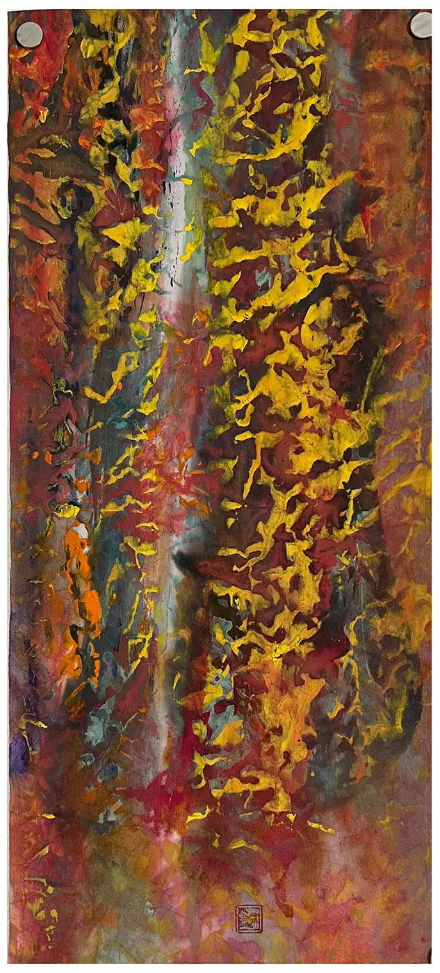 构图: 主体部分形成一股强烈的纵向流动趋势。色彩与墨迹仿佛受地心引力牵引,自上而下地倾泻、流淌、碰撞,创造出一种瀑布般的动态效果。